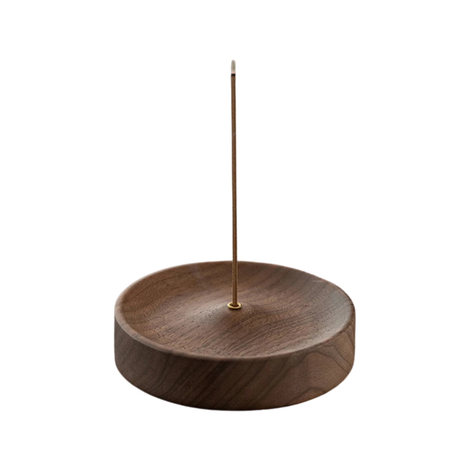 עשוי עץ טבעי בגימור חלק ועגול, עם מחזיק מתכת דקיק בצבע זהב שתומך בקטורת בעדינות – כמו נקודת שקט במרכז הסערה.